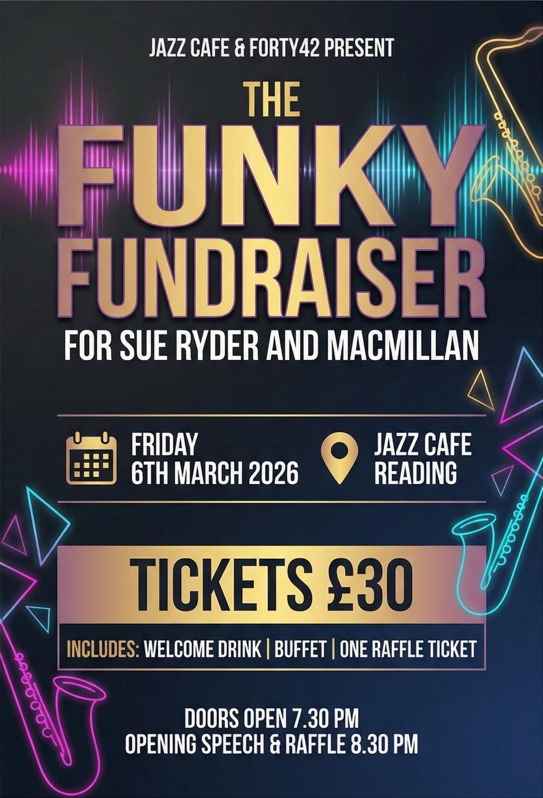 The Jazz Cafe and Fort42 present a Funky Fundraiser event, The entry only ticket includes a buffet, welcome drinks and a raffle ticket.
